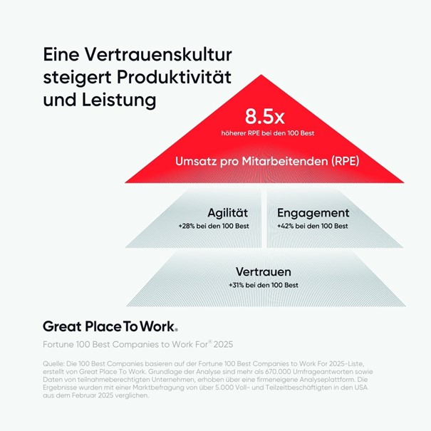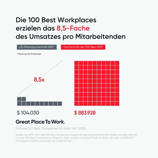 Vertrauen, Wertschätzung und gute Führung sind nicht nur kulturelle Werte – sie sind messbare Wettbewerbsvorteile. Das zeigt die neue Liste der „Fortune 100 Best Companies to Work For 2025“ ebenso wie die aktuellen Ergebnisse der Best Workplaces Austria 2025 von Great Place To Work Österreich. Unternehmen mit einer exzellenten Arbeitsplatzkultur erzielen eine deutlich höhere wirtschaftliche Performance – und sind damit erfolgreicher, widerstandsfähiger und zukunftsfähiger.