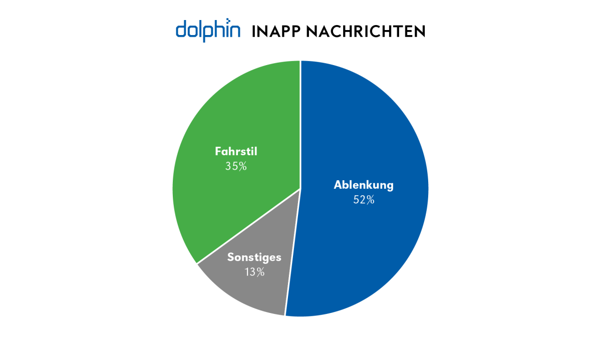 Dolphin versendet jährlich knapp unter 1 Mio. Warnungen und Empfehlungen pro Jahr direkt in die Kunden-Apps von Versicherern und Mobilitäts-Dienstleistern. Der größte Teil sind Hinweise zur Ablenkung durch Handy-Nutzung, Geschwindigkeit und Eco-Driving, aber auch zu Gefahrenstellen oder erhöhter Gefahr wie beispielsweise rund um die Zeitumstellung. Diese „inApp Nachrichten“ verteilen sich auf folgende erkannte Gefahrenquellen: 52% Ablenkung, 35% Fahrstil, 13% Sonstige.