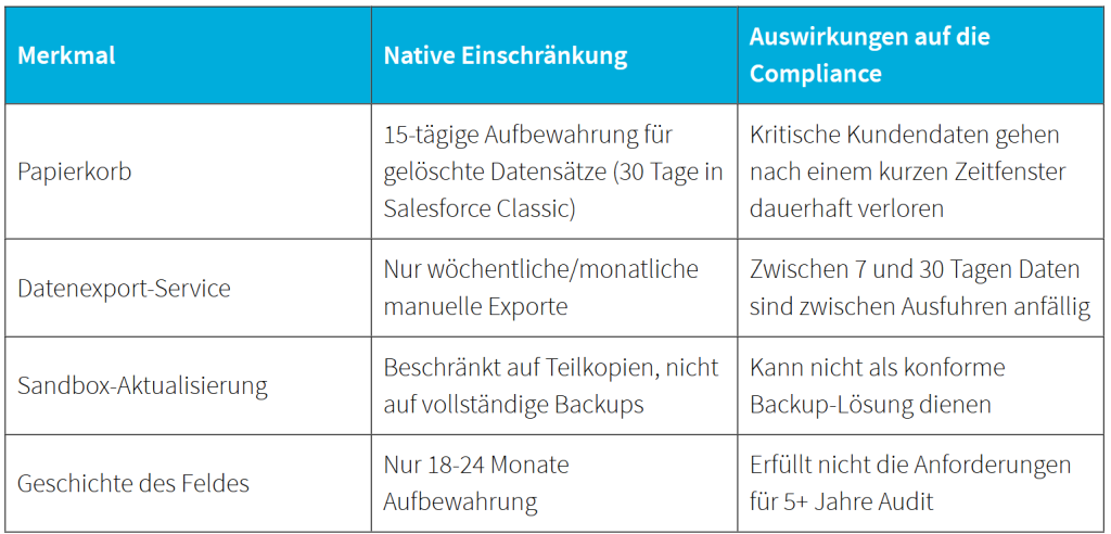 Salesforce: Salesforce-Umgebungen bringen ihre ganz eigenen Herausforderungen mit sich. Unternehmen, die sich ausschließlich auf native Salesforce-Funktionen verlassen, sehen sich häufig mit erheblichen Compliance-Lücken konfrontiert, die sich aus den begrenzten Backup-Optionen der Plattform ergeben, die im Wesentlichen auf eine grundlegende „Papierkorb“-Funktion beschränkt sind, die nicht zu echten Aufbewahrungsmanagementfunktionen passt.