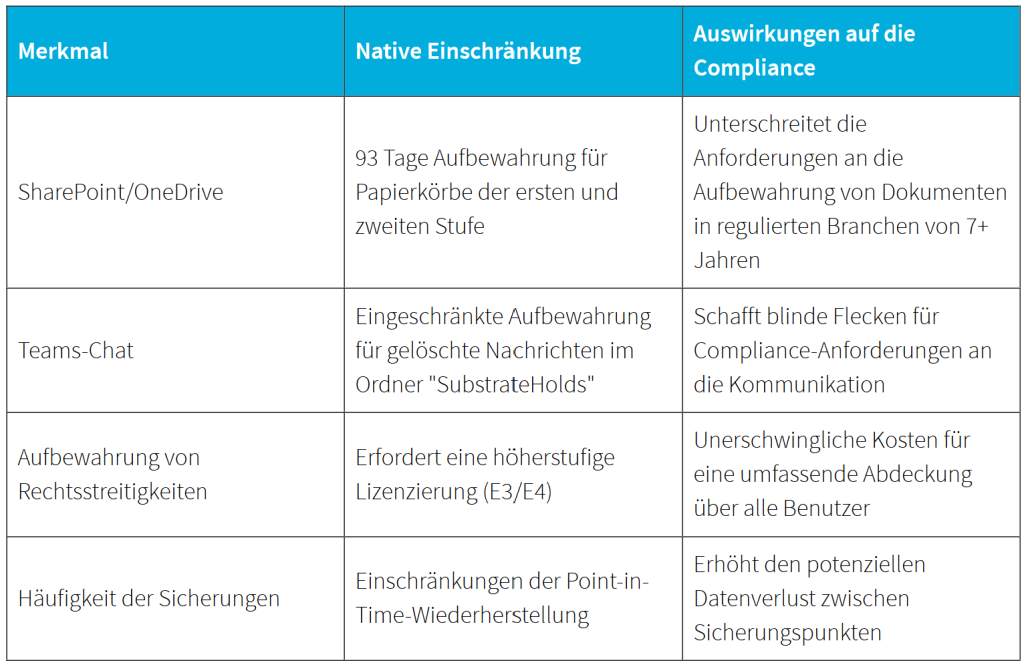 Microsoft 365: Trotz des robusten Funktionsumfangs sollte man sich bewusst machen, dass die Datenaufbewahrung von Microsoft 365 begrenzt ist. Die Plattform hat Aufbewahrungseinschränkungen speziell für Exchange Online- und SharePoint-Daten, sodass möglicherweise nicht alle Compliance-Anforderungen von Unternehmen erfüllt werden.
